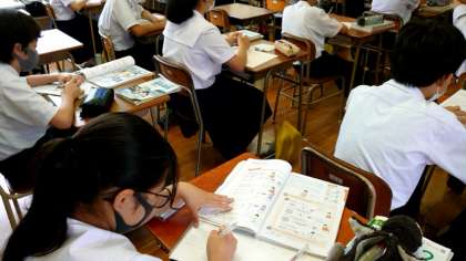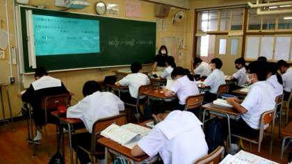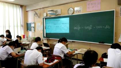 2年生理科の授業で「化学式」を学習中。今日は、炭酸水素ナトリウム(NaHCo₃)の熱分解のようすを化学式で示します。入試でよく出る化合物の化学式は暗記が必要なようですね。先生のお話をよく聞いて必須の化合物の化学式をメモしておきましょう。