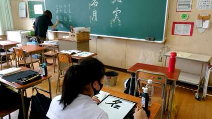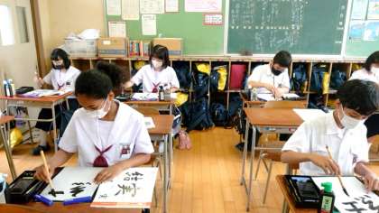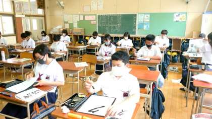 1年生国語科で分割授業を実施中。クラスを2つに分けて「書道 OR 文法」を教わります。書道の教室では「行書」の練習を行っています。文字に丸みを持たせ、柔らかな印象になるよう、筆を運びます。皆さんとても上手ですよ。
