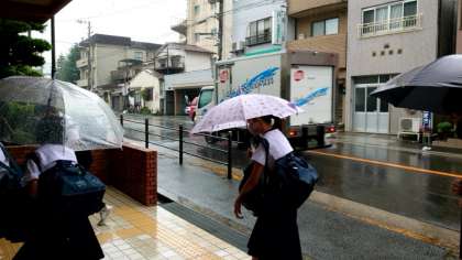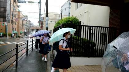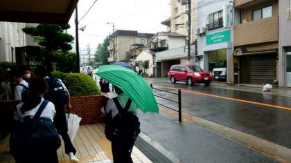 (上から)雨が降る中、傘を手に登校してきました