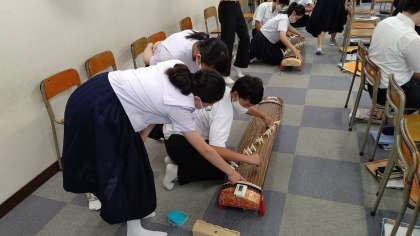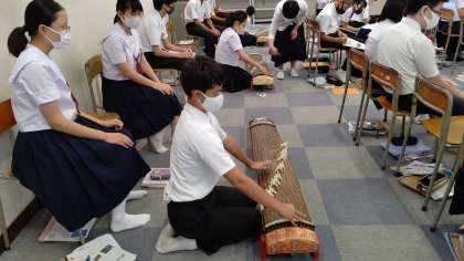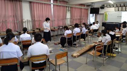 音楽科で4限目に研究授業を行いました。「荒城の月」を題材に歌詞の意味や作曲者の意図を理解し、表現を工夫して演奏することを目標に学習しました。「押し手」という技法を用いて琴の音を出すことにも挑戦しました。チューナーを使って音程の確認を行い、どの程度できているか班で話し合うこともできましたね。
