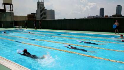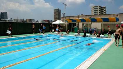 1年生男子体育科で水泳の授業を行っています。今日はビート板を持ってバタ足の練習です。気温もグングン上昇し、まさに水泳日和ですね。皆さん水しぶきをあげながら、気持ちよく泳いでいます。