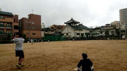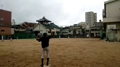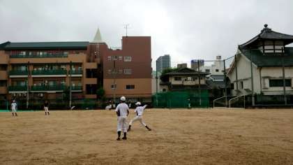 現在、運動場で野球部の皆さんが練習中。朝からの雨も小康状態。今がチャンスと練習にも力が入ります。顧問の先生が打つボールを上手くキャッチしホームへと返球。互いに声を出しあって、プレーの向上をめざします。