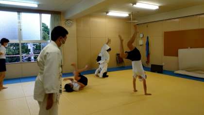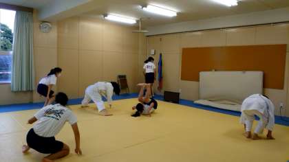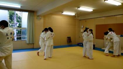 畳が敷かれた教室で柔道部が稽古に励んでいます。柔軟運動で身体をほぐした後、互いに組みあいながら技をかけあいます。柔道着のどの位置を握るかで力加減も変わってくるそうです。