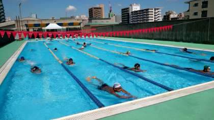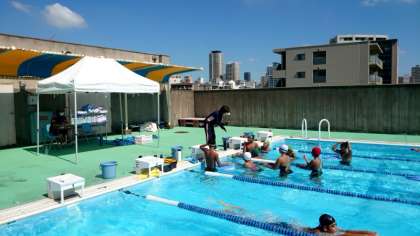 校舎屋上のプールでは今日も水泳部の皆さんが頑張っています。先生のアドバイスを受け、各自ビート板を使って自身のフォームを確かめます。イメージ通りの泳ぎに近づいてきましたか?