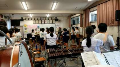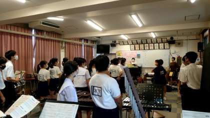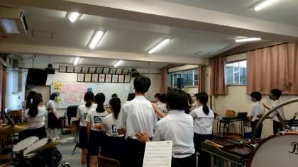 音楽室で吹奏楽部の皆さんがウォーミングアップ中。2人ずつペアになって発声練習を行います。丹田(たんでん:おへその下の下腹部)を意識すると、呼吸や発声に良いそうです。皆さん意識して発声できましたか?