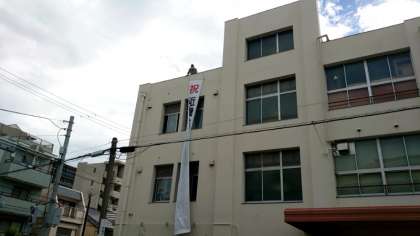 今週末に台風が接近するとの報道を受け、懸垂幕を収納する作業が行われています。近畿地方に上陸する可能性は低いものの、被害が出ないことを願っています。
