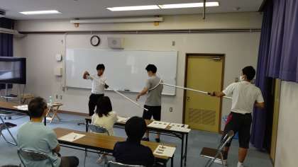 さすまたを用いた実演のようす 不審者役の職員にさすまたを用いています