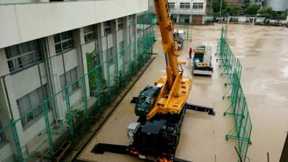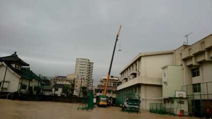 体育館の空調設備工事が終盤を迎えています。今日は大型のクレーン車で室外機を屋上に設置します。雨の中での作業は大変ですが、無事に工事が終わることを願っています。