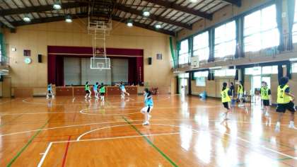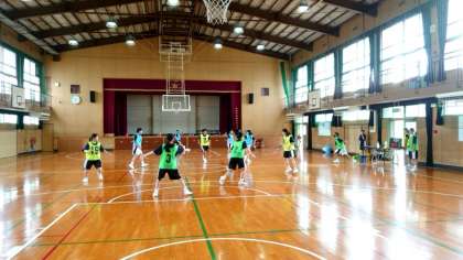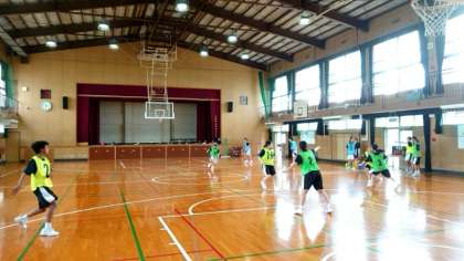 体育館では女子バスケットボール部の皆さんが活動中。攻撃⇔守備のフォーメーションをくり返し練習します。各プレイヤーに常に先を読みながら、瞬時に判断する力が求められます。練習を重ねて、身体が自然と動くようになると良いですね。