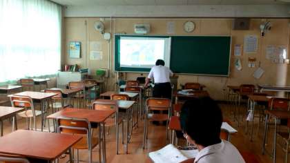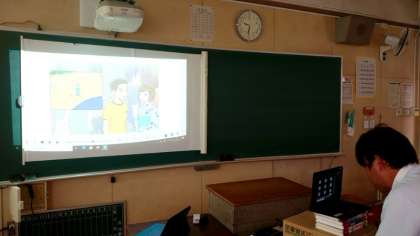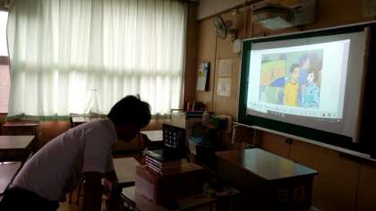 1年2組で英語のオンライン学習中。黒板に映されたイラストを見ながら、先生の質問に答えていきます。音声をオンにすると、皆さんの発言がパソコンから聞こえてきます。思った以上に明瞭で聞き取りやすいですね。