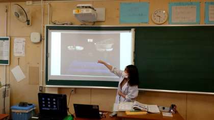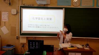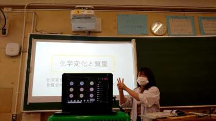 2年3組では理科の学習が行われています。「化学変化が起こる前後で物質の質量はどう変化するか?」が本日のテーマ。まずは動画を視聴して、先生の質問に3択で答えます。双方向通信なので、互いに意見を交わすことができますね。