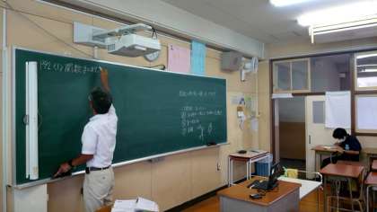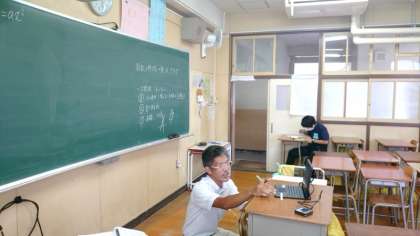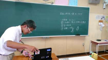 3年4組で数学のオンライン学習中。教科書にそって、二次関数の特徴を教わります。先生の説明を聞く中、質問があればパソコン画面に「挙手」サインが…。皆さんの疑問に先生が答えます。わからない点があればどしどし聞いてくださいね。