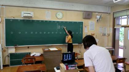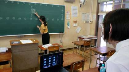 1年生国語科で「古文のかな遣い」を学習中。事前に配付しているプリントをもとに先生が説明されます。パソコンの画面を通して、皆さんから質問や疑問が届きます。しっかりと理解できるまで教えてもらってくださいね。