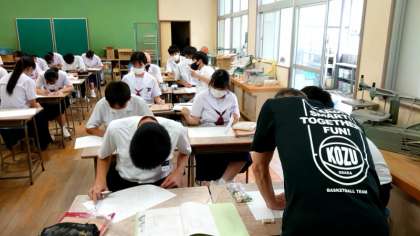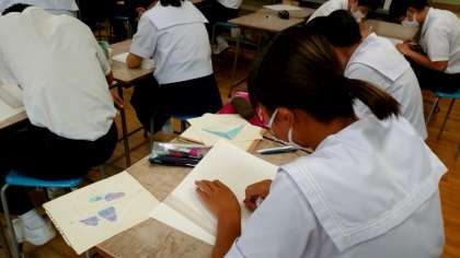 3年生美術科で「透視図法」を用いた作品を制作します。定規を巧みに使って立体感を持たせます。まずは画用紙に鉛筆で下書きし、色を塗り終えれば完成です。文化祭の教科作品として出品するかも…。