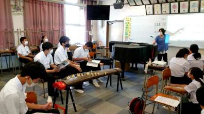 2年生音楽の授業でお箏の演奏に取り組みます。課題曲は「荒城の月」。皆さんよく知っているメロディーを奏でます。後日、実技テストがあるそうです。今のうちにしっかり練習して、当時に備えましょう。