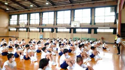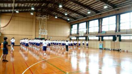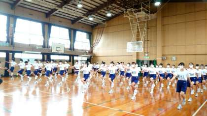 3年生は体育館で体育大会の練習中。昨日の合同練習を振り返り、入場行進から始めます。縦横の列が乱れないよう、互いの位置を確かめながら力強く行進します。立派な行進を楽しみにしています。