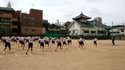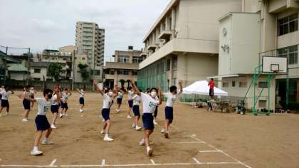 運動場では2年生が学年演技に取り組んでいます。踊りの振り付けはすっかり覚えた模様。今度は集団での隊形移動にチャレンジします。音楽にあわせて集団が変化する様子がカッコ良いですね。