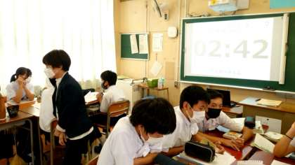 おススメ本の紹介を通して、読みたい本を投票するビブリオバトル。今日は2年生でバトルがくり広げられています。皆さん本を手にとり、魅力を猛アピール。制限時間3分にまとめるのは至難の業ですね。