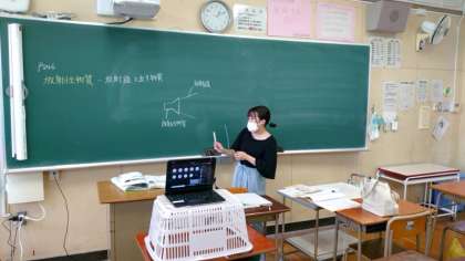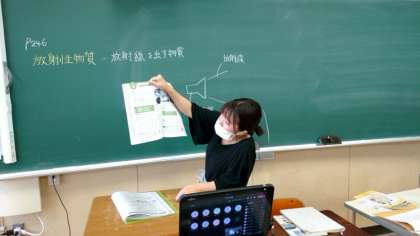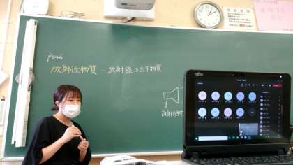 オンライン学習午後の部が始まりました。2年理科では「放射性物質の特徴」を学習します。先生が教科書を手に解説中。お家では、生徒の皆さんが教科書の同じページを開けていることと思います。離れていても、集中力を切らさず頑張ってくださいね。