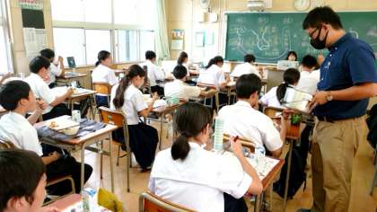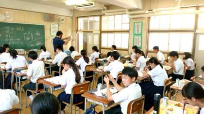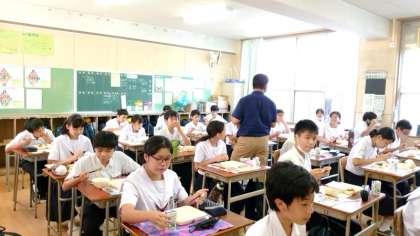 1年4組でランチタイムを楽しんでいます。今日は「肉じゃが・厚揚げ・あっさりキュウリ・焼きのり」の和食献立。現在、先生が「あっさりキュウリ」のお代わりを配食中。好きな人はたくさんいただきましょう。