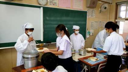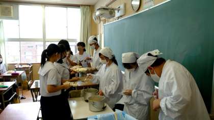 昼休みのチャイムが鳴り、皆さんお待ちかねの昼食です。今日は「キーマカレー・キュウリのピクルス・白桃」の人気メニュー。配食時に、カレー大盛りをリクエストする人もいるかもしれませんね。