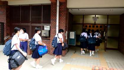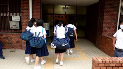 (上から)修学旅行のカバンを手に登校です