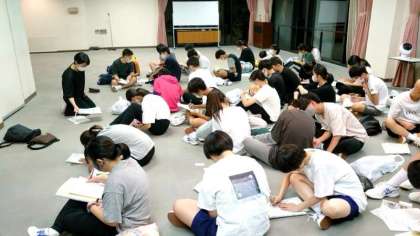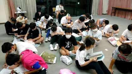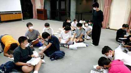 現在、学年を2クラス毎に分けて、入浴&終わりの会を行っています。3組の皆さんは1日の振り返り中。平和学習の感想を話し合っています。