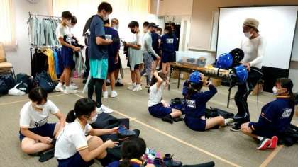 ウェットスーツやヘルメットなど、身体に合う装具を着用します。