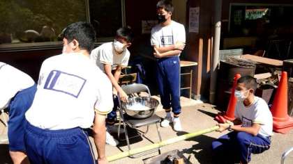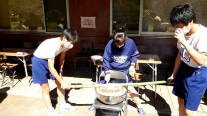 竹の棒に、少しずつ生地をかけていきます。焼け具合を確かめながら、みんなで協力してください。
