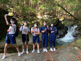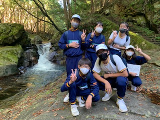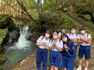 河鹿の滝に到着。清流にすむ小さなカエル「かじか」から名付けられた美しく小さな滝です。水も冷たく、少し肌寒いです。
