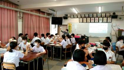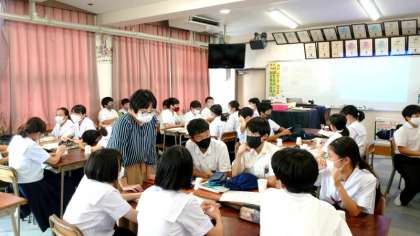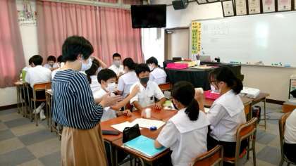 1年生音楽の授業で「CUPS(カップス)」に取り組みます。CUPSとは、流れる音楽にあわせて拍手したり、コップや机をたたいてリズムをきざむプレイのこと。4組では「プリテンダー」の曲にあわせて、気持ちよくリズムを刻んでいました。