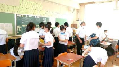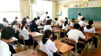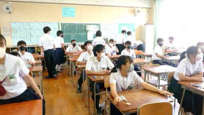 テスト開始まであと5分。2年生の教室では教科書などの持ち物をロッカーに収め、テストを受ける準備を整える人の姿がみられます。2年生の皆さんは時間前行動がしっかりと身に付いていますね。