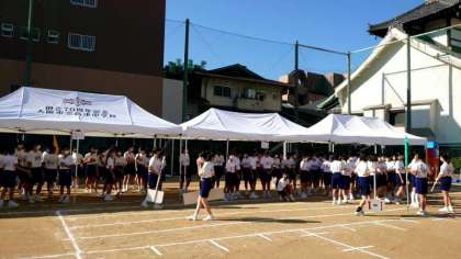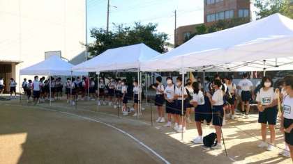 生徒の皆さんが、運動場にやってきました。まもなく始まります。