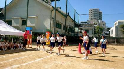 1年女子に続いて、2年女子がリレーの腕を競います。8名の精鋭が次々にバトンをつなぎます。どのクラスもベストを尽くしましょう。