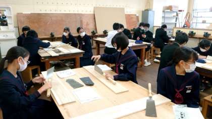 1年生技術科で木工の製作実習が始まりました。木の板を加工して、「マガジンラック」や「飾り棚」を作ります。まずは先生からノコギリの使い方を教わります。製作は次回の授業から。皆さん楽しみですね。