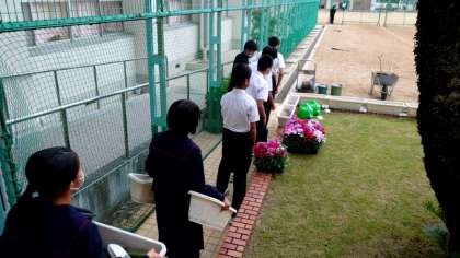 創立70周年記念式典にむけた取り組みが行われています。昨日の放課後、1,2年の学級委員長さんが集まり、各学年で考えた「お花」を植え付けました。先生から説明を受けた後、みんなで運動場へと向かいます。