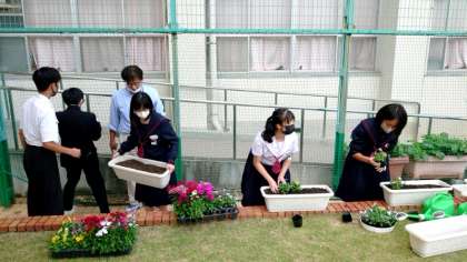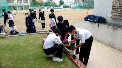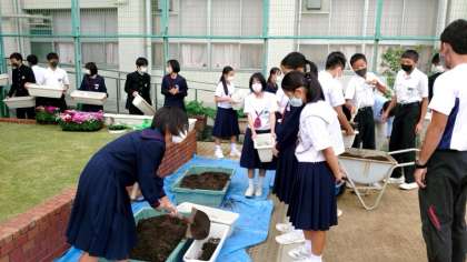 花の植え付け作業が始まりました。1年生は「ビオラ」、2年生は「ナデシコ」の苗をプランターに植え付けます。3年は実力テストのため、後日取り組むそうです。皆さん楽しそうですね。