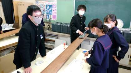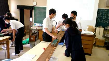 3年生理科で「物体の運動」を学習中。今日は「台車・ばねはかり・記録タイマー」を使って台車の運動を記録します。長い木の板の上を台車が走ります。思った以上の速さに驚きますね。皆さん、上手く記録がとれましたか?