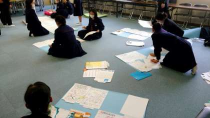 各教室では展示作品の飾りつけが進んでいます。英語科では各学年で英語の作品掲示の準備中。3年では、SDGsに関連し「海洋環境の保護」をテーマに英文でまとめた作品が出品される模様です。