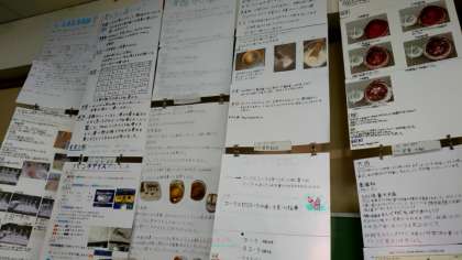 理科室では自由研究作品がずらりと並びます。夏休みに取り組んだ実験や観察の成果をまとめています。実際の写真も取り入れ、見ていてわかりやすいですね。