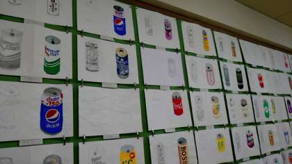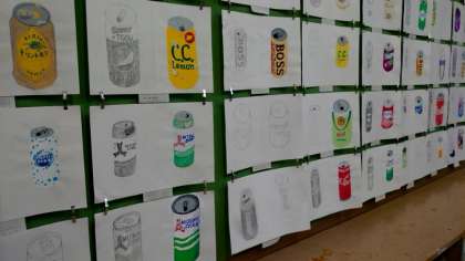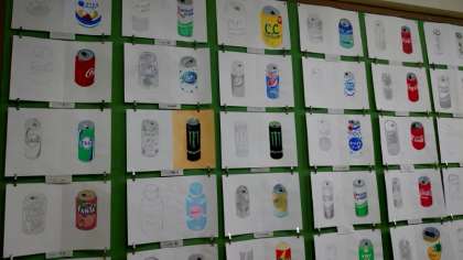 美術室では各学年で制作した絵画や木彫の作品を展示中。空き缶のデッサン画は商品のロゴマークまで忠実に再現されていますね。