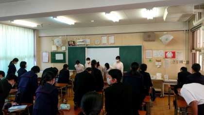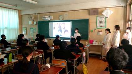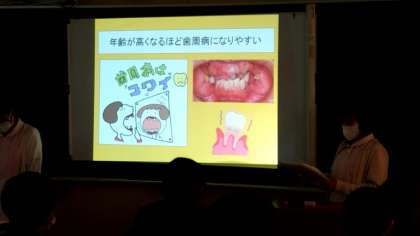 1年生対象に「歯磨き教室」が行われています。校区にある歯科衛生士専門学校から先生をお迎えし、ご指導を受けています。スクリーンに「歯の健康」に関する資料が映し出されていますね。