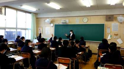 大阪市教育センターより講師先生に来ていただき、研究授業を実施中。まずは、1年2組の道徳の研究授業を観ていただきます。教科書の読み物教材を使って、学習がすすみます。皆さん、いろんな意見を発表しています。
