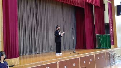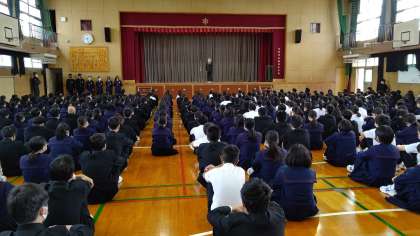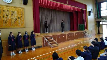 いつも通り、素早い集合で全校生徒が体育館に集合し、全校集会が行われました。校長先生からは、70周年記念式典で全校生徒で取り組んだ、花と詩の取組の振り返りのお話がありました。各学年、それぞれの目標が表れていたことや今後バトンをつないでいくことの大切さのお話でしたね。次の80周年、90周年につなげていってくださいね。
