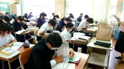 2年生英語科で「比較級」の学習中。「AはBより…です」など2つのものを比べる表現を習います。皆さん、ペアを組んで繰り返し例文を話しています。反復練習で発音もブラッシュアップされますね。