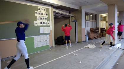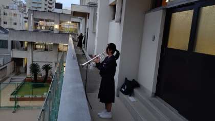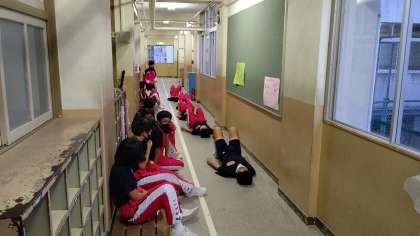 放課後に、校内の廊下を上手に使って部活動の練習が行われています。各部で場所を仲良く分け合って練習に励んでいますね。今日は、運動場が雨の影響で外の活動の運動部も廊下を使用しています。