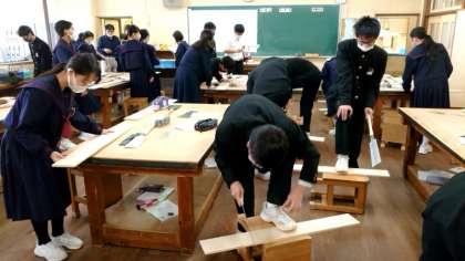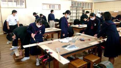 説明後、早速作業開始です。木の板をしっかり固定してノコギリ引きに挑戦します。初めてノコギリを扱う人もいる模様。ケガキ線にそって上手く切れると良いですね。