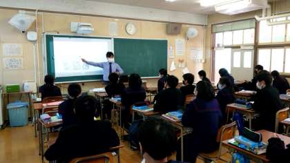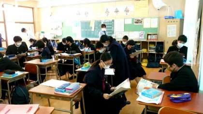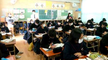 1年生英語科で研究授業が行われました。今日は「不定詞の用法」について学習します。まずは英会話のトレーニングから。英語を使うことで、頭の中を英語モードに変えていきましょう。