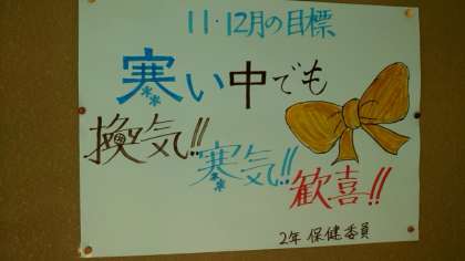 保健委員さんが作成した目標が掲示されています。休憩時間等に教室の換気を行うよう、よびかけています。教室内にも新鮮な空気を入れるようポスターが貼っていますね。皆さんの健康を守るため、こまめな換気を心掛けましょう。