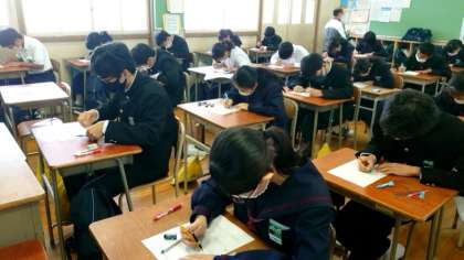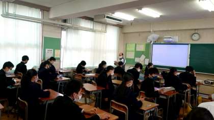 2年生数学科で小テストを実施中。授業に入る前に、これまでの学習内容を振り返ります。問題は文字式や1次関数など幅広く出題されているそうです。多くの問題を解くことで実践力を養いましょう。